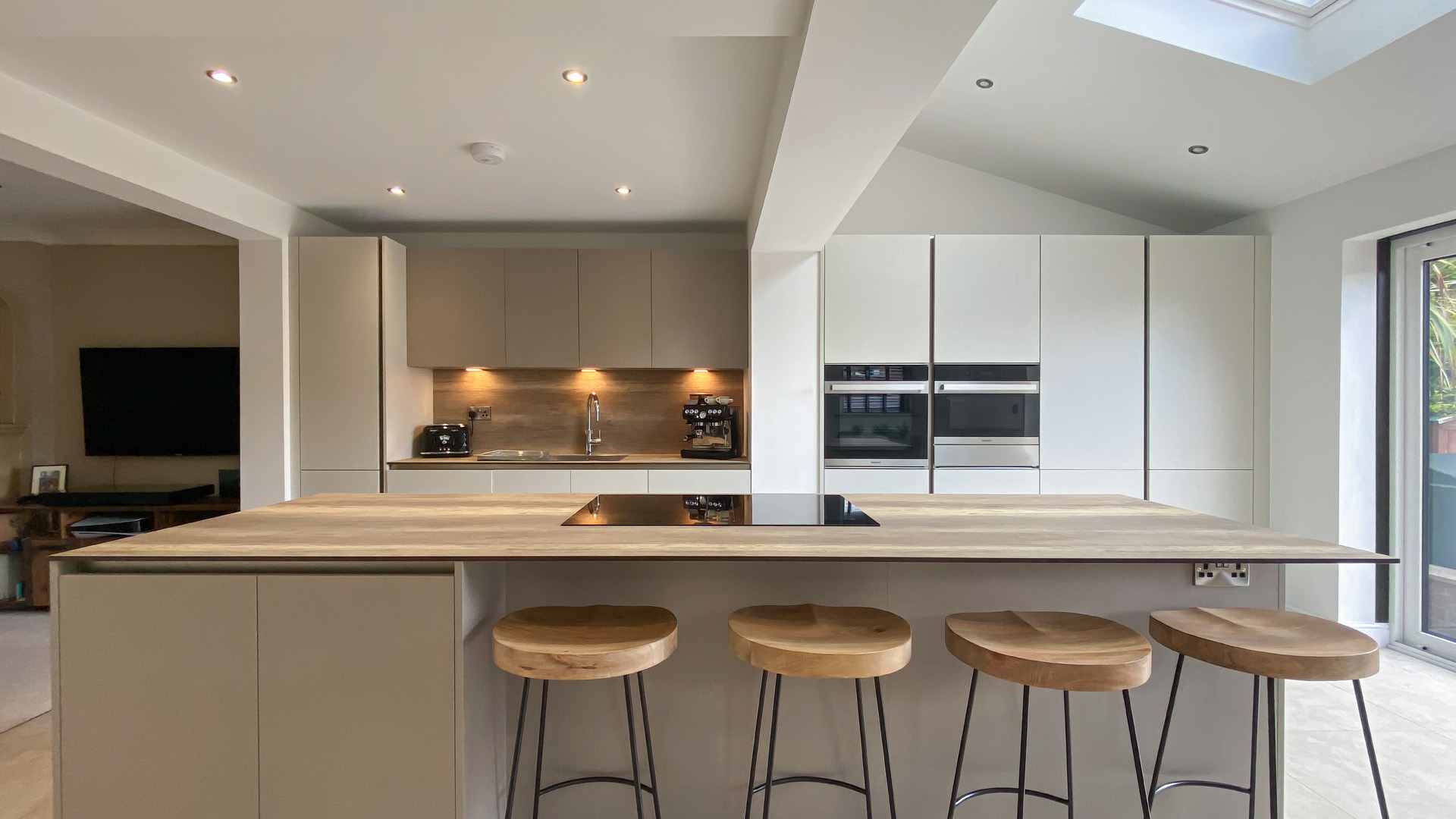 The overhanging breakfast bar brings continuity to the island whilst creating a social space to sit and eat.